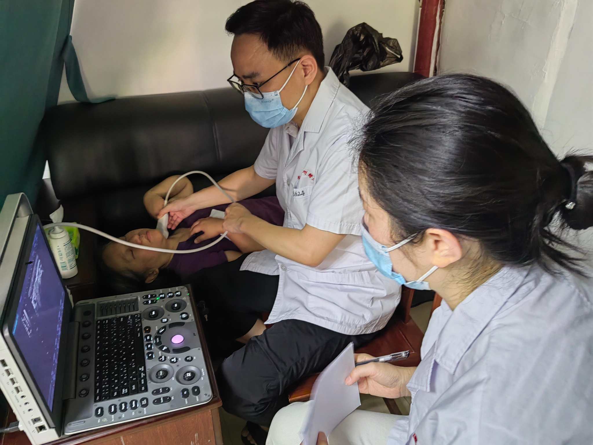 在甲狀腺彩超檢查區(qū)域,專業(yè)的超聲醫(yī)生全神貫注地操作著儀器,為居民進行細致的檢查,并結合檢查結果給予專業(yè)的建議和指導。