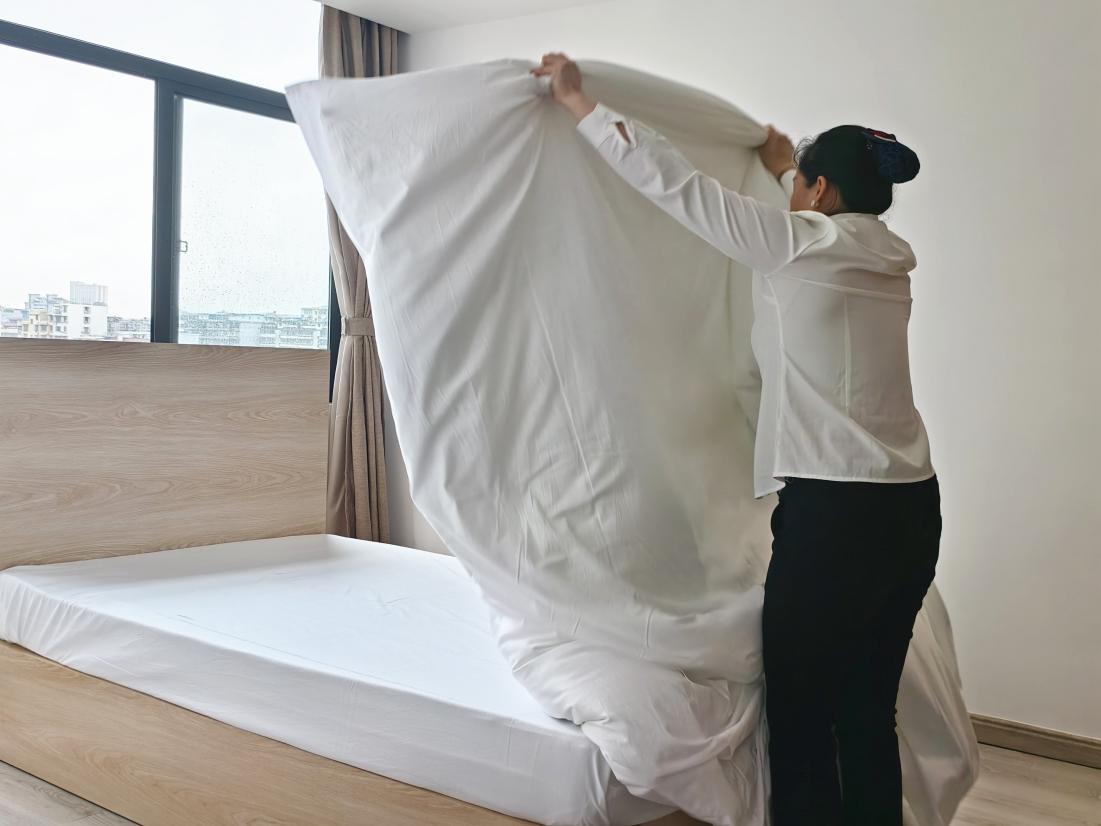 比賽現(xiàn)場,參賽服務(wù)員們迅速進(jìn)入“戰(zhàn)斗”狀態(tài),在緊張而有序的氛圍中大展身手。隨著一聲令下,他們動作嫻熟、一氣呵成:雙手輕揚,潔白的床單如靈動的蝶翼在空中翻飛,轉(zhuǎn)瞬便平整地鋪展在床上;緊接著,套被套、折被角,每一個步驟都精準(zhǔn)到位,盡顯扎實功底。經(jīng)選手們精心塑造,原本松散的被芯變得棱角分明、挺括有型,將標(biāo)準(zhǔn)化服務(wù)流程與藝術(shù)美感完美融合。評委們秉持公平公正原則,從操作規(guī)范程度、完成效率、細(xì)節(jié)處理等多個維度進(jìn)行細(xì)致評分,不放過任何一個細(xì)節(jié),確保賽事結(jié)果真實反映選手水 平。